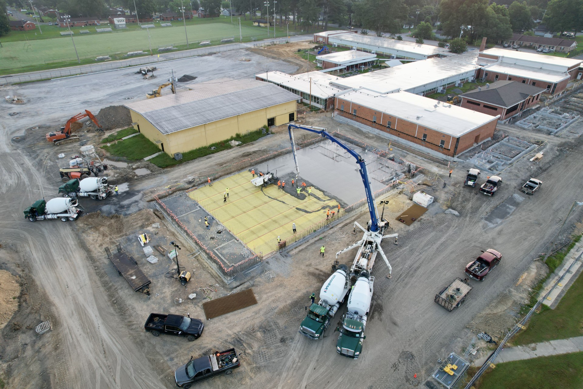 Turnkey concrete delivery for Cullman Intermediate School, including all structural and site concrete from footings/slabs and elevated beams to curbs, sidewalks, and concrete paving.